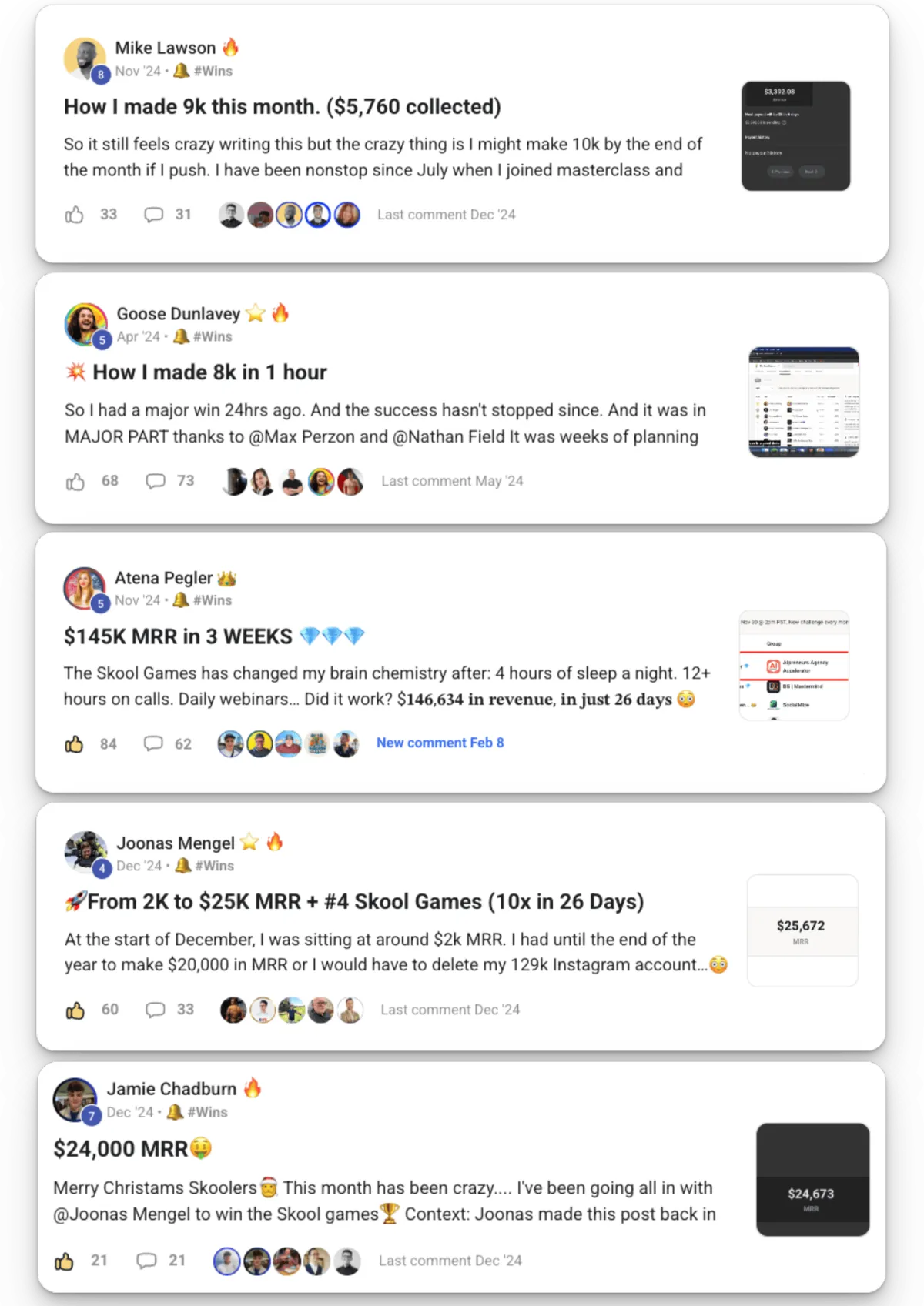 “At the beginning of December we had $0 MRR. But we had a massive goal. On the last day of the Skool Games we woke up with 15k MRR… We were #15 on the leaderboard.”